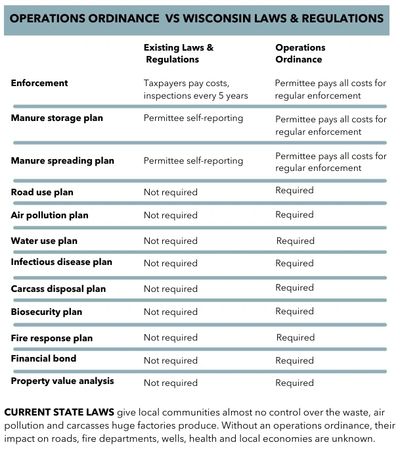 Current laws give local communities almost no control over the waste, air pollution and carcasses these huge factories produce. Without an operations ordinance, their impact on roads, wells, health and the economy are unknown.